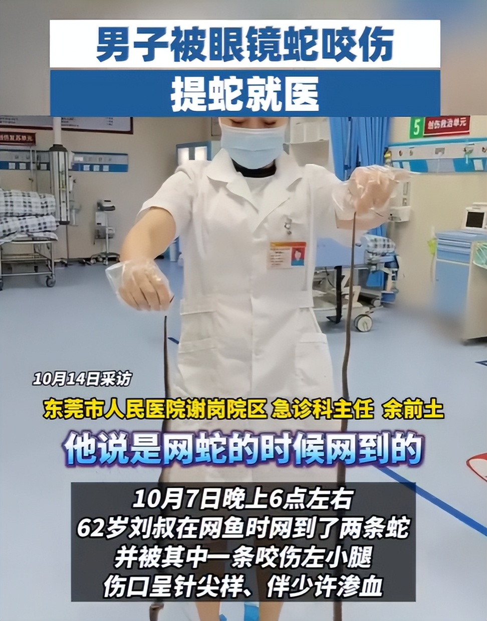 近日,广东东莞,62岁的刘大叔在网鱼时网到了两条蛇,并被其中一条咬伤左小腿,他立即将两条蛇打死后,提着蛇来到医院急诊科就诊。