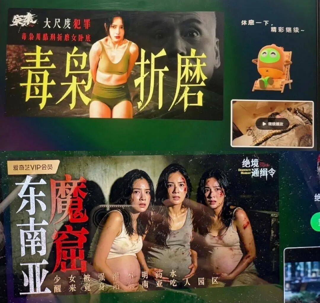网友发布的大量截图与录屏显示,爱奇艺的争议弹窗广告集中出现在剧集暂停界面,广告画面聚焦女性受虐场景:女警角色被绑、穿着暴露,三位女性满眼惊恐护着怀孕的肚子。文案表述为“毒枭用酷刑折磨女卧底”“东南亚魔窟”“少女被强灌不明药水,醒来竟身陷东南亚吃人园区”。